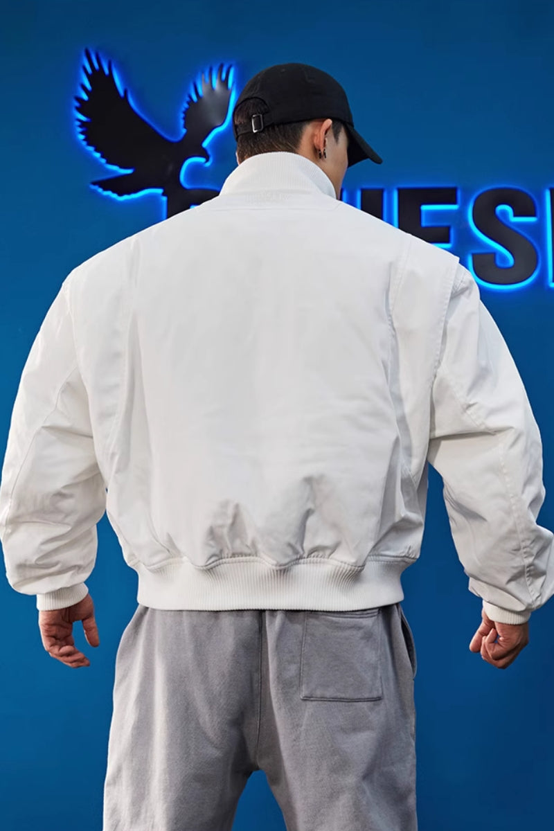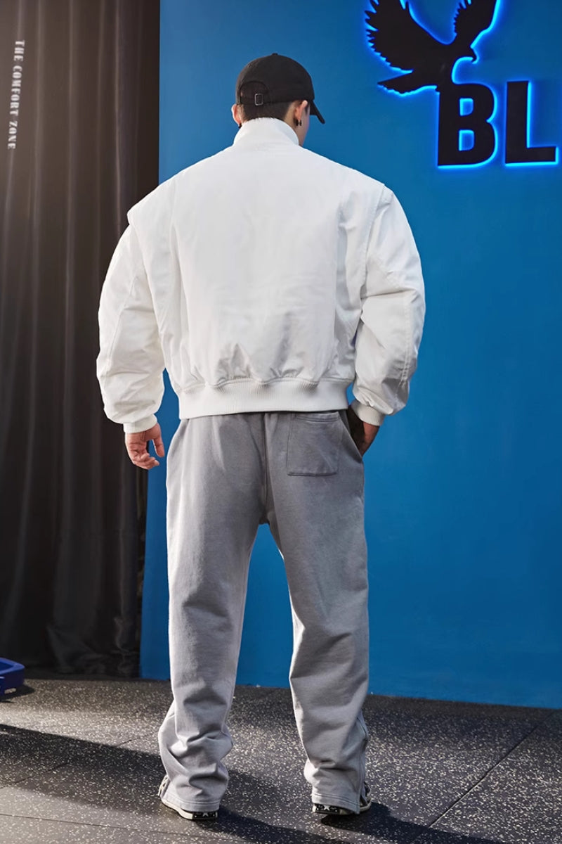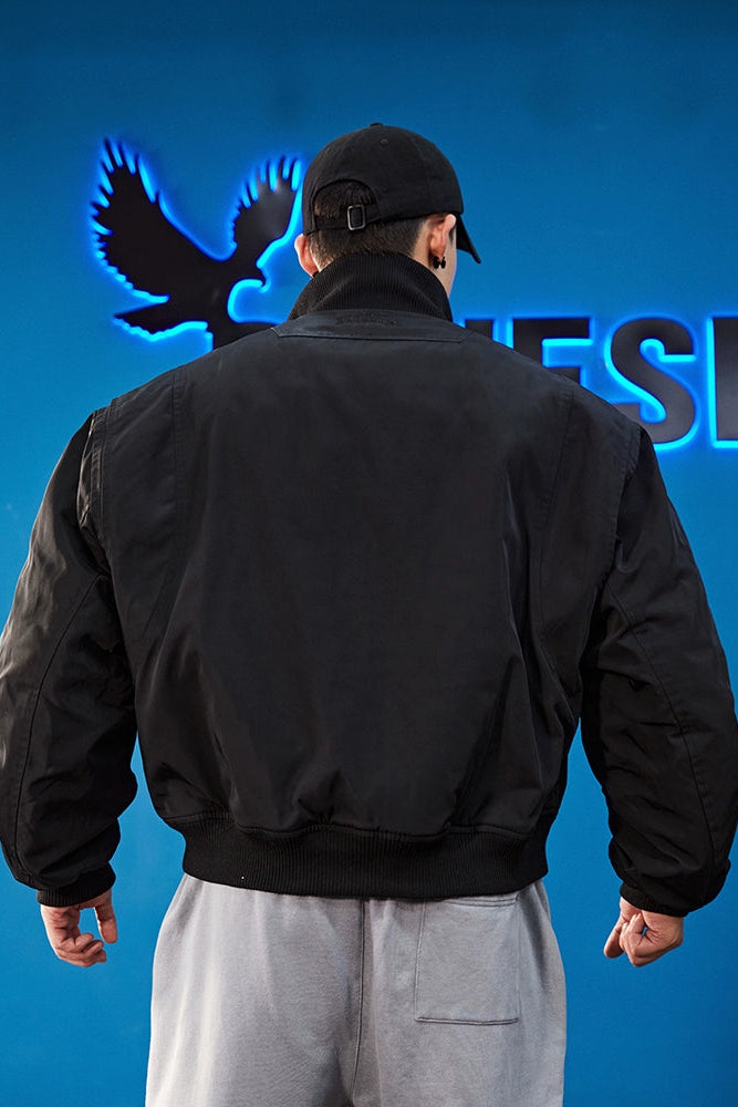 立体的なショルダーラインと短丈シルエットが特徴の中綿ボンバージャケット。肩から腕にかけてのワイドなボリューム設計により、トレーニー体型をより力強く見せるフォルムを構築。2000gの高密度中綿を採用し、軽量ながら高い保温性と防風性を両立。表面はマットなポリエステル生地で、無骨ながらも洗練された印象に。