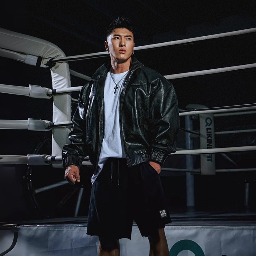 短丈ワイドシルエットで無骨な存在感を放つフェイクレザージャケット。55%PU×45%ビスコース混紡の素材を使用し、柔らかさと光沢感を両立。シボ感のある質感がヴィンテージライクな雰囲気を演出し、男らしいタフさを引き立てます。立ち襟とフロントジップで着脱もスムーズ、リブ仕立ての袖口と裾がフィット感を高め、保温性も確保。シンプルながら迫力あるシルエットで、トレーニング後の羽織りからストリートスタイルまで幅広く活躍する一着。