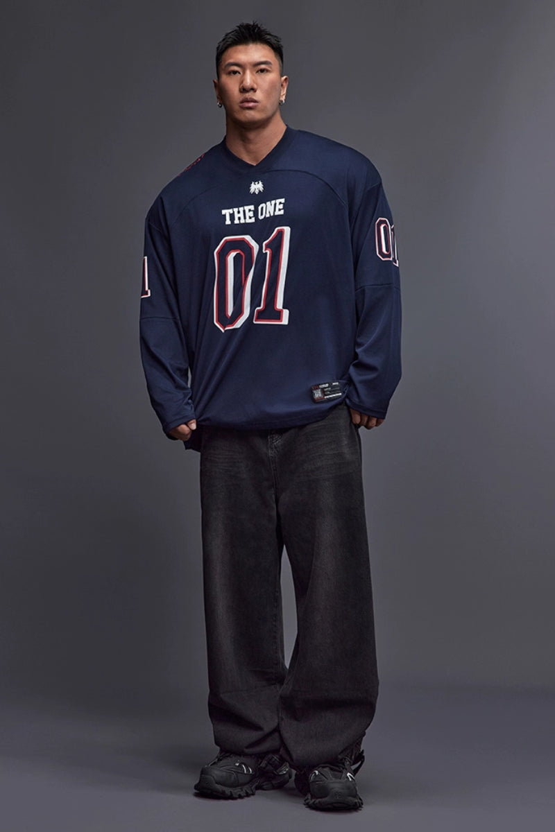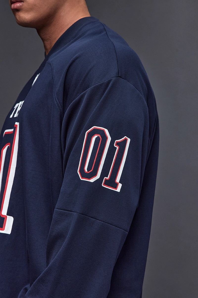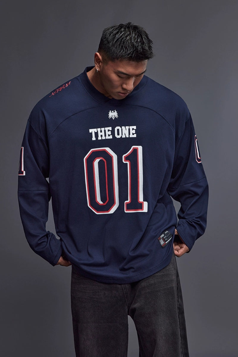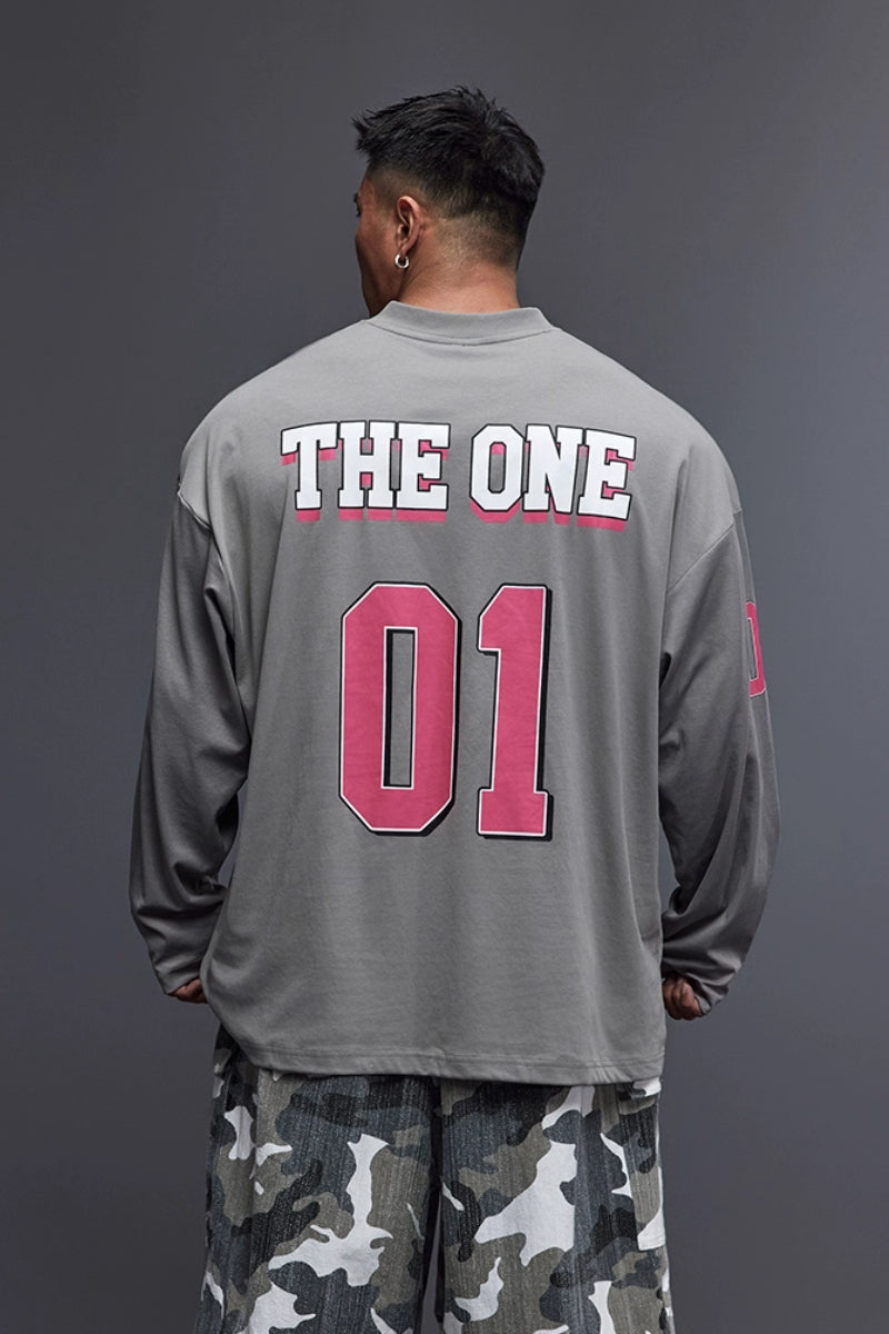 落ち感のあるワイドシルエットで、トレーニー体型にも快適に着用できるジャージロングスリーブ。フロントとスリーブに施された「01」ナンバリングプリントが存在感を放ち、スポーツとストリートを融合したデザイン。吸湿速乾性に優れたコットン×ポリエステル混紡素材を採用し、トレーニング時もドライで快適。