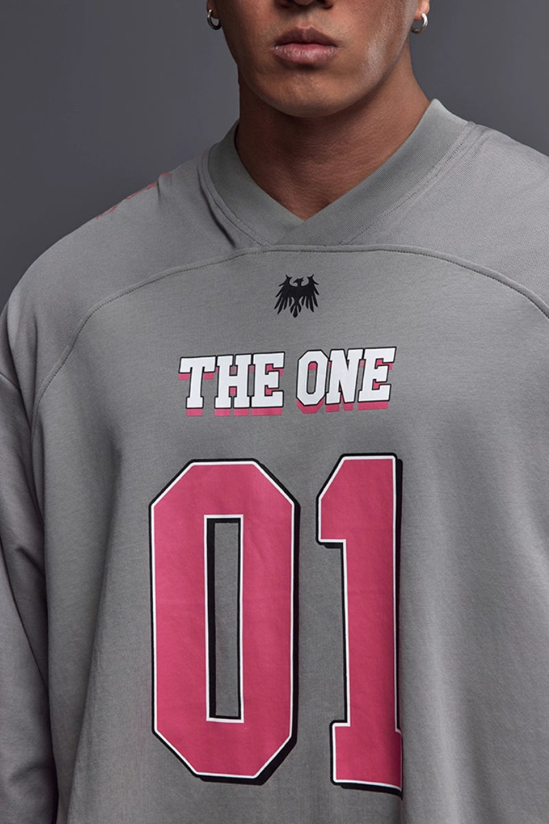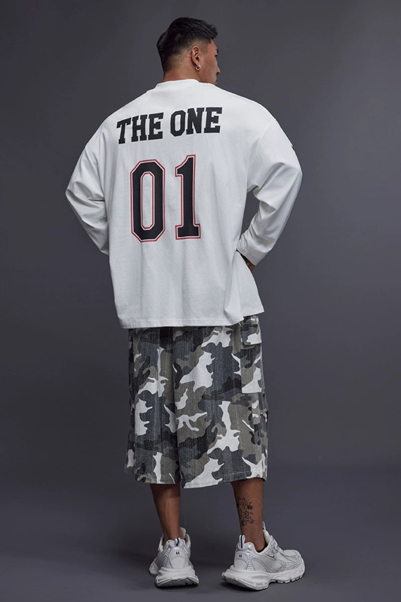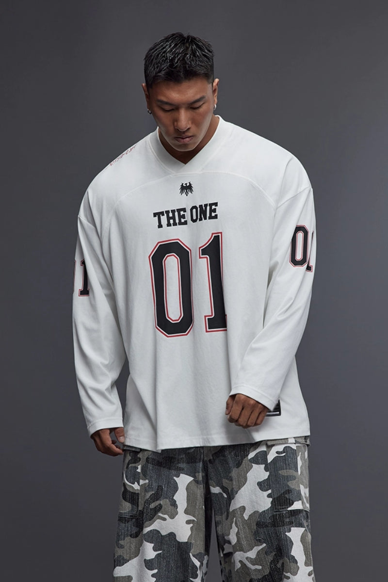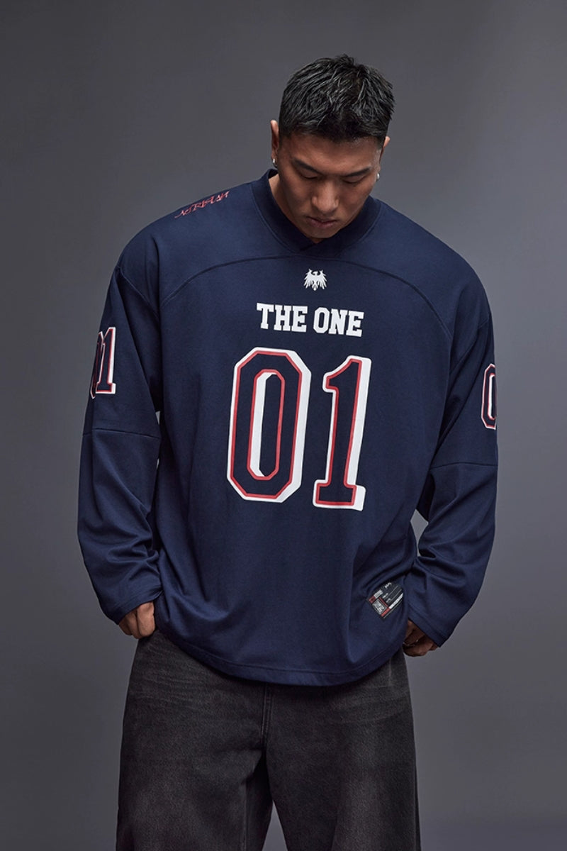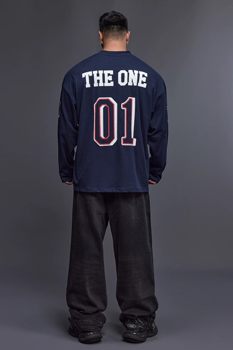 落ち感のあるワイドシルエットで、トレーニー体型にも快適に着用できるジャージロングスリーブ。フロントとスリーブに施された「01」ナンバリングプリントが存在感を放ち、スポーツとストリートを融合したデザイン。吸湿速乾性に優れたコットン×ポリエステル混紡素材を採用し、トレーニング時もドライで快適。