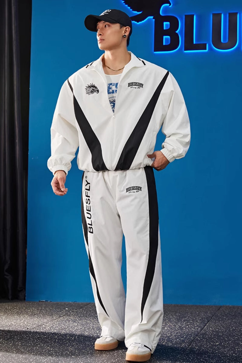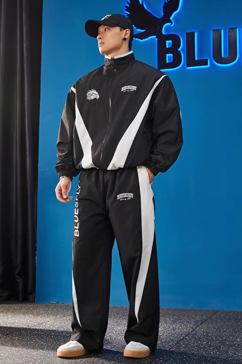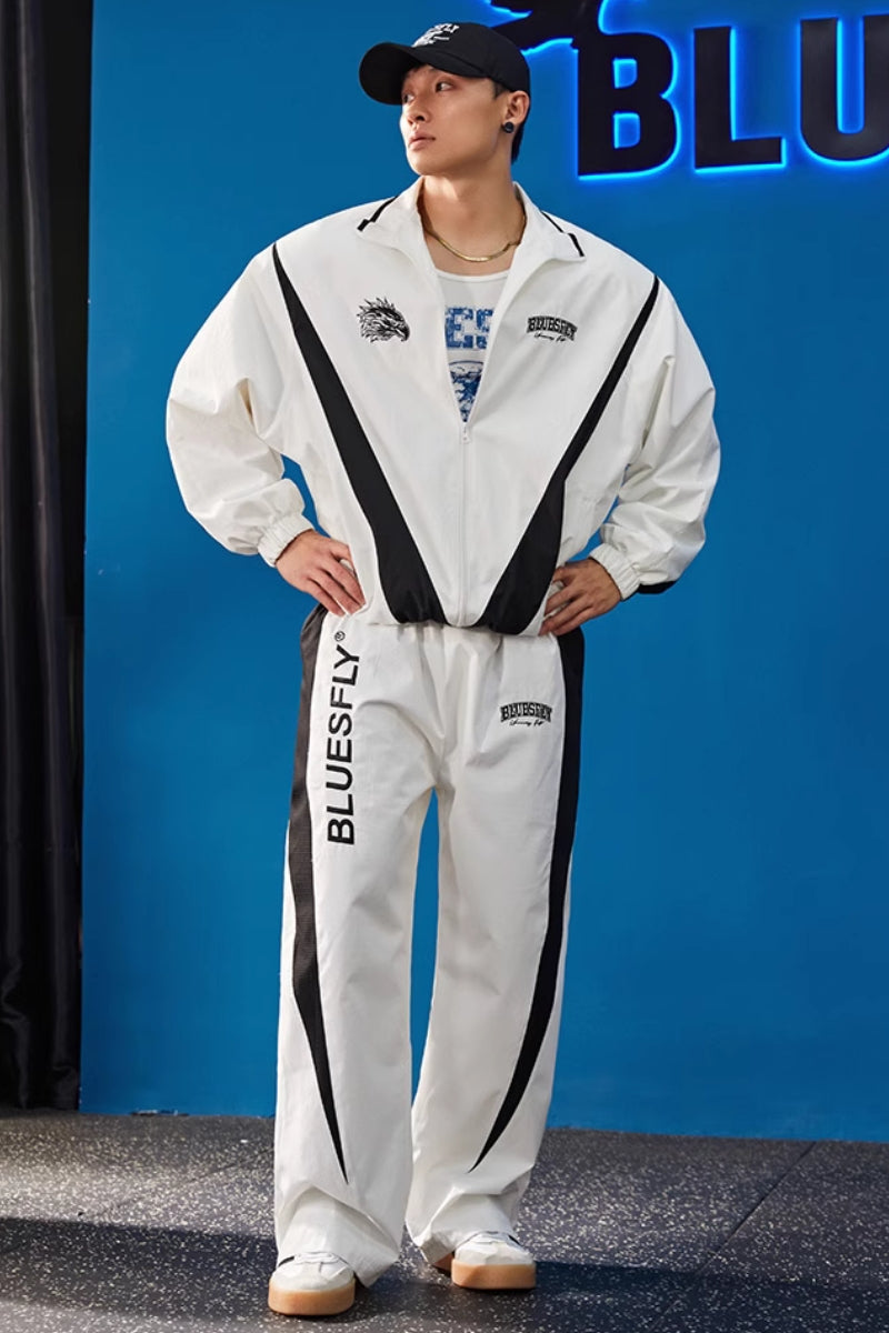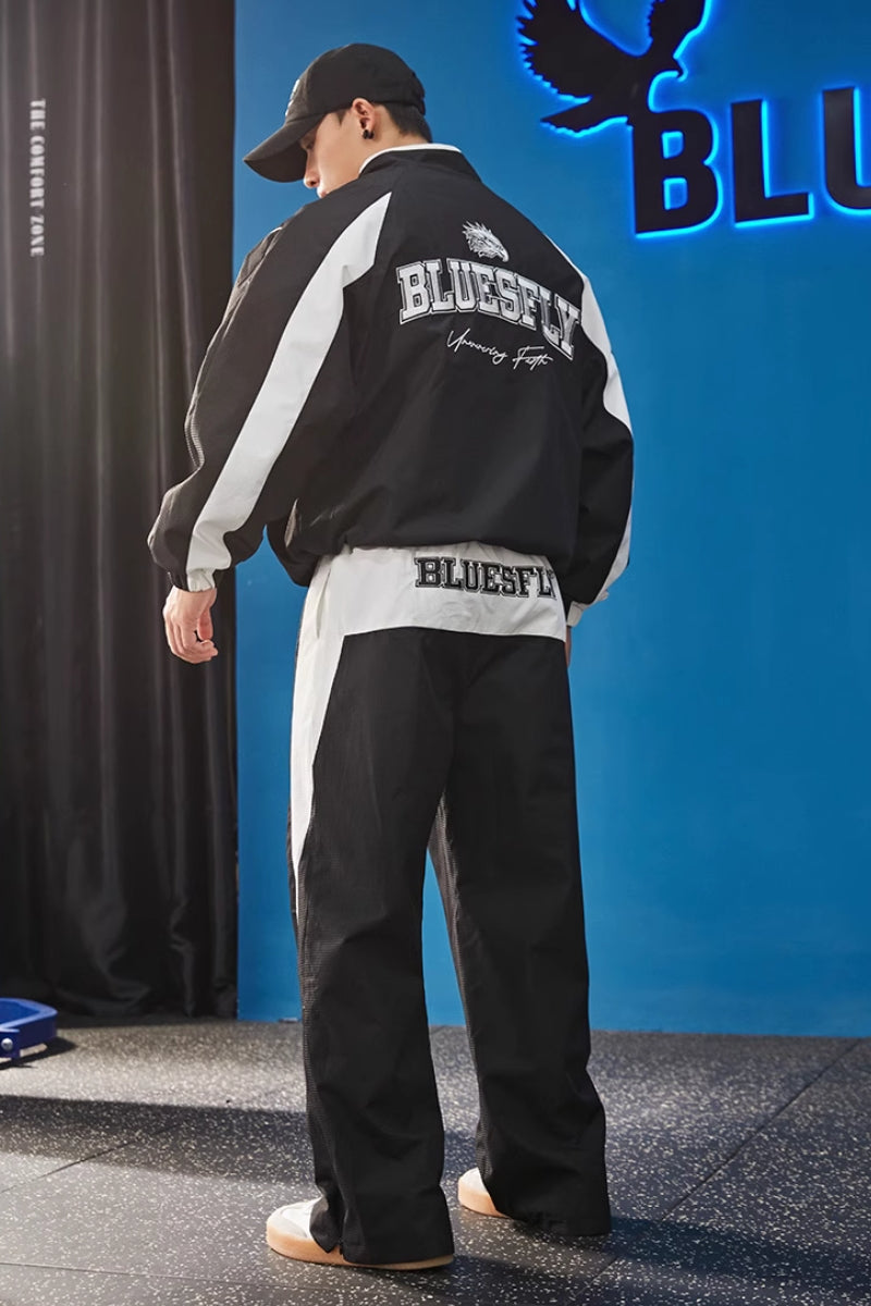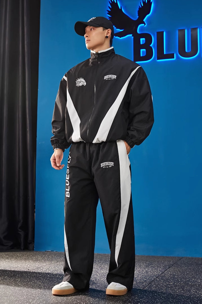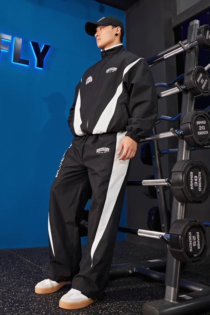 シャープな切り替えラインが印象的なトラックスーツセットアップ。軽量で耐久性のあるポリエステル素材を使用し、防風性と快適な通気性を兼備。ジャケットは立ち襟デザインとゆったりめのシルエットで動きやすく、パンツは中腰設計とストレートシルエットでスタイリッシュに仕上げています。ジムでのトレーニングからストリートコーデまで対応できる、スポーツとファッションを両立した一着です。