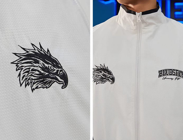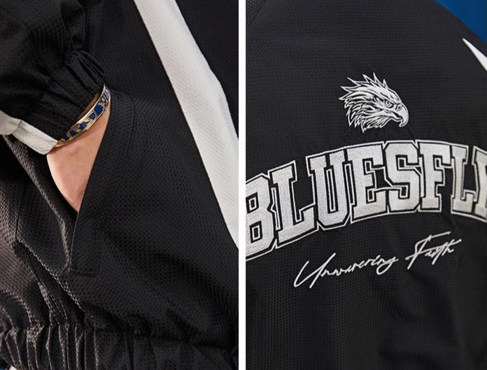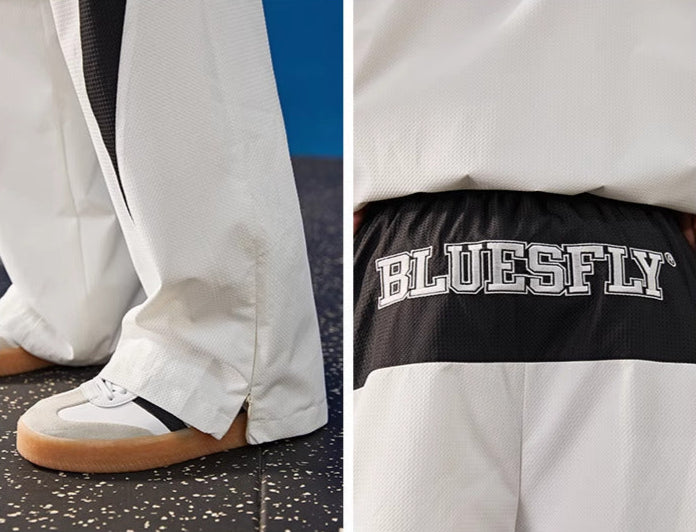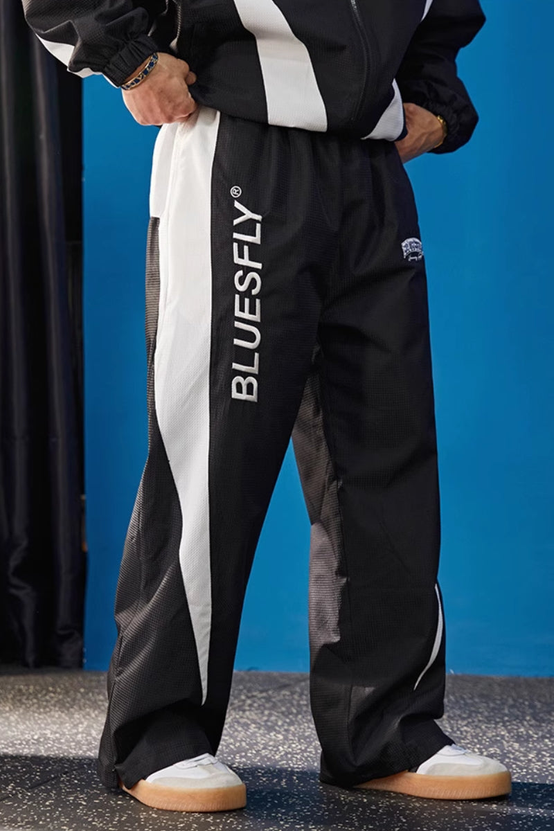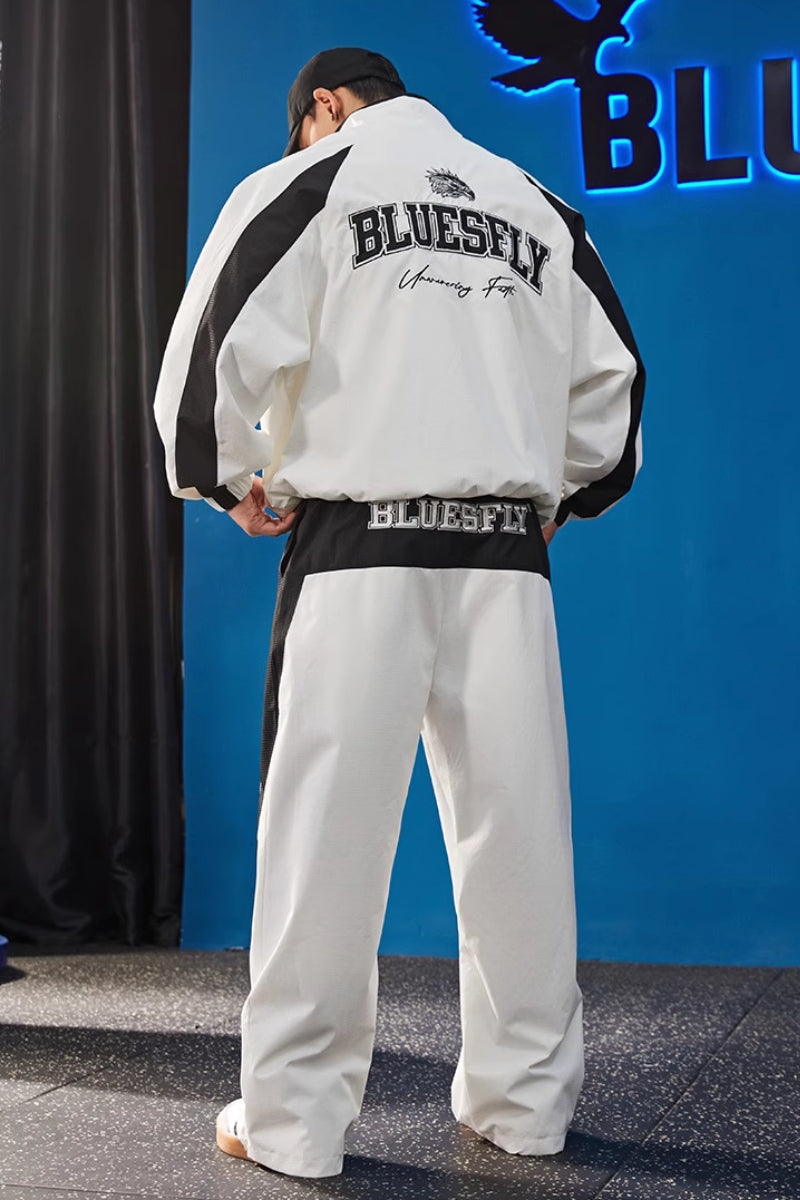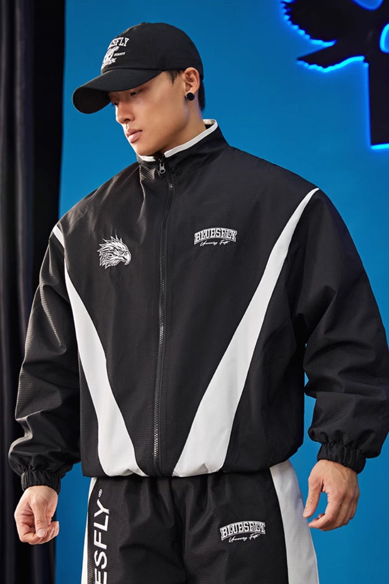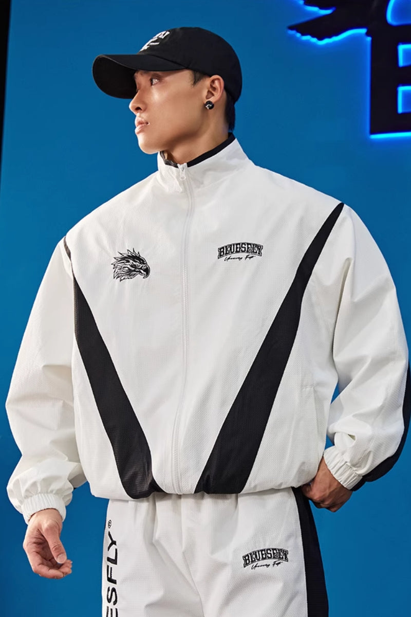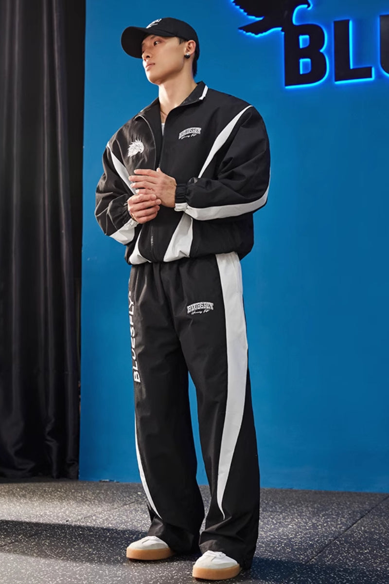 シャープな切り替えラインが印象的なトラックスーツセットアップ。軽量で耐久性のあるポリエステル素材を使用し、防風性と快適な通気性を兼備。ジャケットは立ち襟デザインとゆったりめのシルエットで動きやすく、パンツは中腰設計とストレートシルエットでスタイリッシュに仕上げています。ジムでのトレーニングからストリートコーデまで対応できる、スポーツとファッションを両立した一着です。