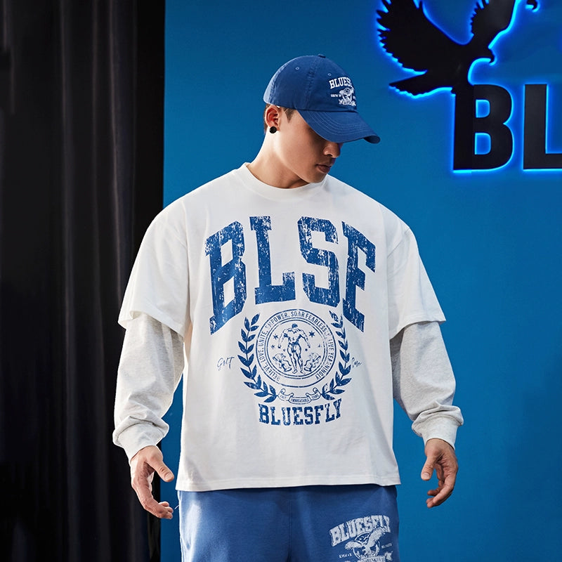 カレッジロゴを大胆に配したデザインと、袖のレイヤード構造が特徴のロングスリーブTシャツ。200gのダブル紗織りコットンを採用し、しっかりとした厚みと柔らかな肌触りを両立。ゆったりとしたワイドシルエットがトレーニー体型にも自然に馴染み、トレーニング後のリラックスシーンからタウンユースまで幅広く対応。