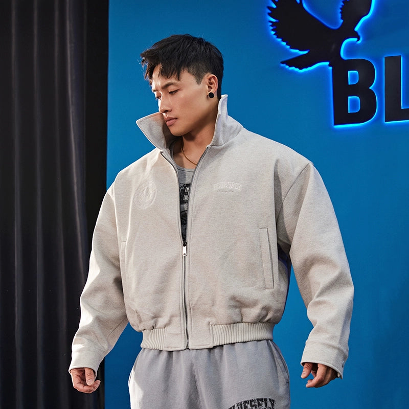 落ち感のある立体ショルダーと短丈シルエットが、上半身のフレームを際立たせるモックネックジャケット。肉厚なポリエステル混生地はハリ感と柔らかさを兼ね備え、体のラインを拾わず構築的なフォルムをキープ。リブ仕様の裾が腰回りをすっきりと見せ、トレーニー体型にも自然に馴染む設計。