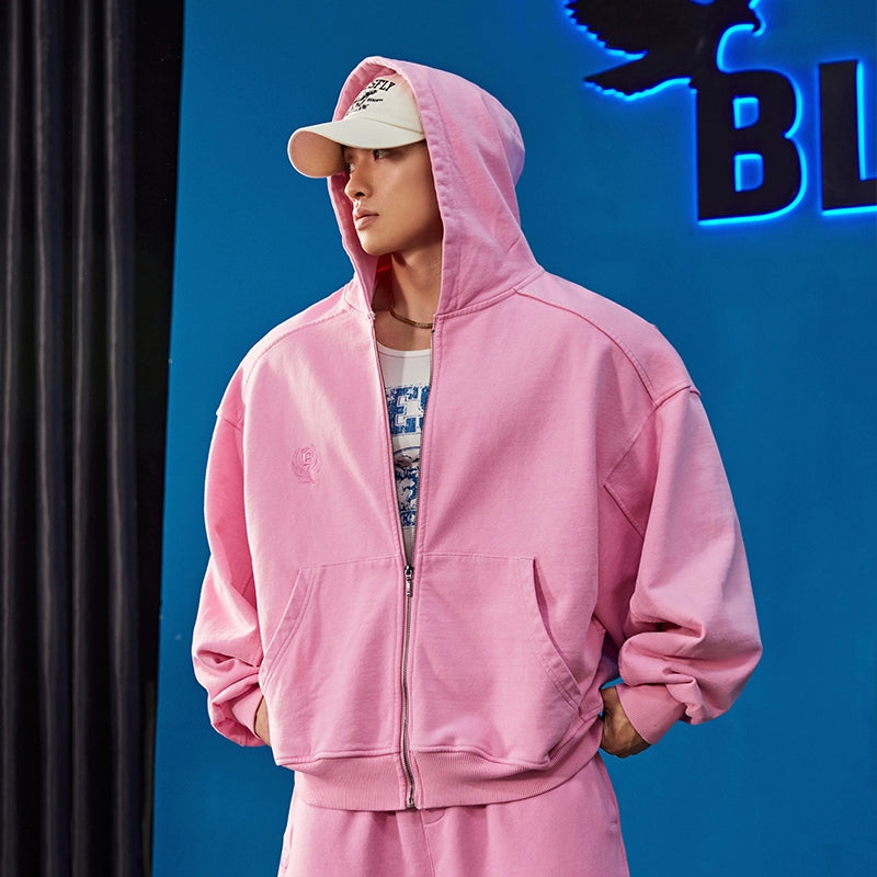 肉厚なコットン素材を使用したジップアップパーカー。落ち感のあるドロップショルダーとワイドシルエットで、トレーニー体型にもゆったり快適に着用可能。裏地はコットンで保温性があり、トレーニングやタウンユースに最適。フロントポケット付きで利便性も兼ね備えた万能な一着です。