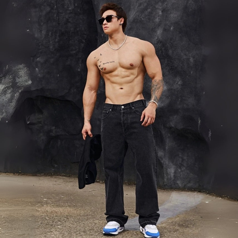 ヴィンテージ感漂うウォッシュドブラックのデニムパンツ。コットンをベースにポリエステルやレーヨンを配合し、耐久性と快適さを兼備。裾はカットオフ仕様でラフな表情を演出し、ストリート感を際立たせます。ワイドストレートのリラックスシルエットで動きやすく、デイリーからトレーニング後のカジュアルスタイルまで幅広く活躍。