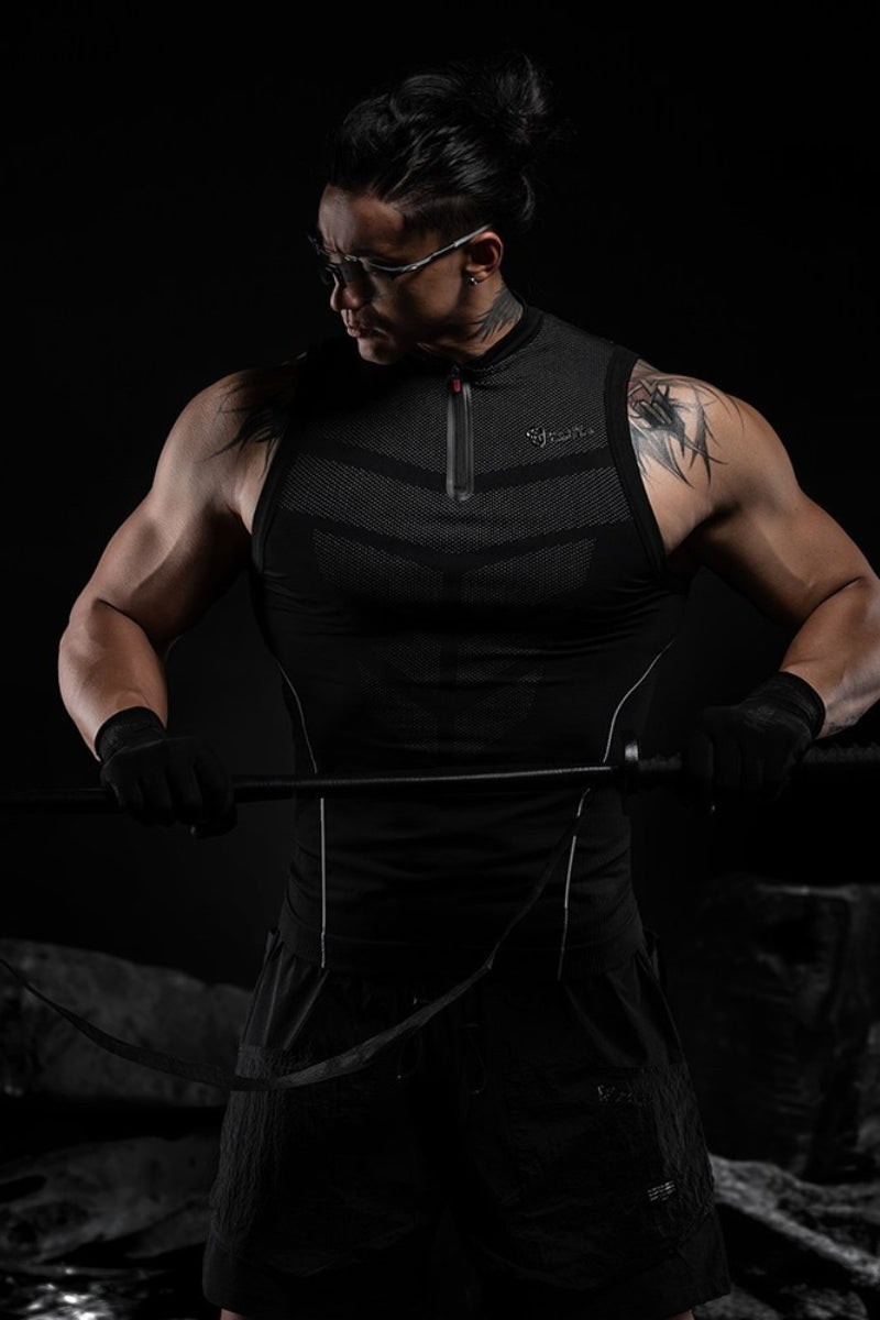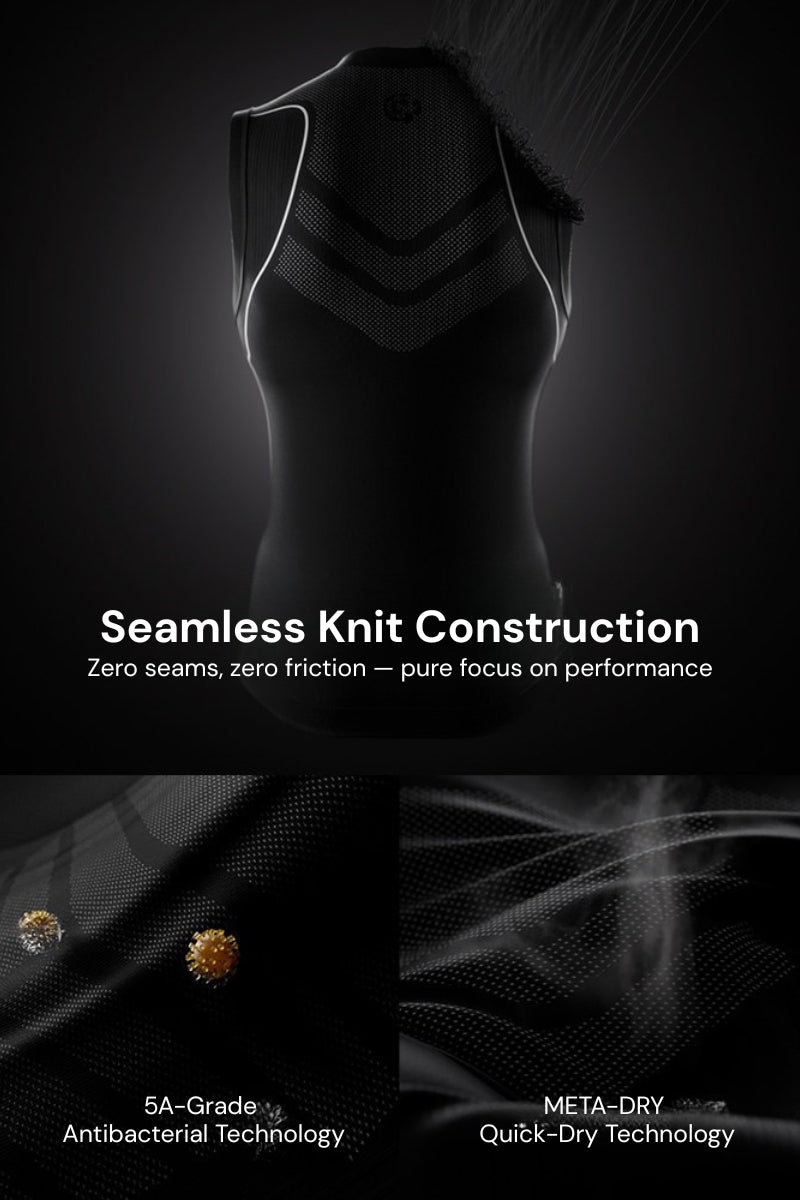身体の輪郭に沿って一体編みで仕上げられたシームレス構造が、胸・肩から背中にかけて筋肉ラインを立体的に引き締め、逆三角シルエットを自然に際立たせるコンプレッションベスト。縫い目ゼロの一体編織により肌との摩擦を限りなく排除し、トレーニング中のあらゆる動作域にストレスなく追従する。胸元には1/4ジップを採用し、着脱のしやすさと体温調節の自由度を両立。META-DRY速乾テクノロジーが汗を瞬時に拡散・蒸発させ、5A級抗菌テクノロジーが体臭の原因となる菌の繁殖を高水準で抑制。激しいトレーニング中も常にドライで清潔な着心地を維持する。