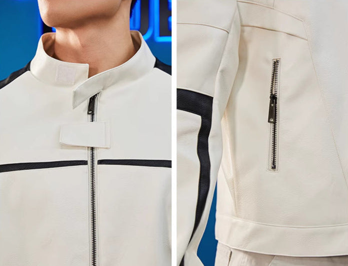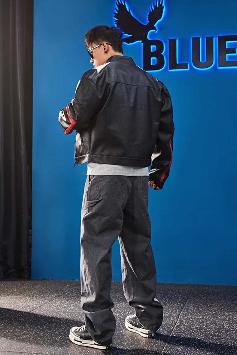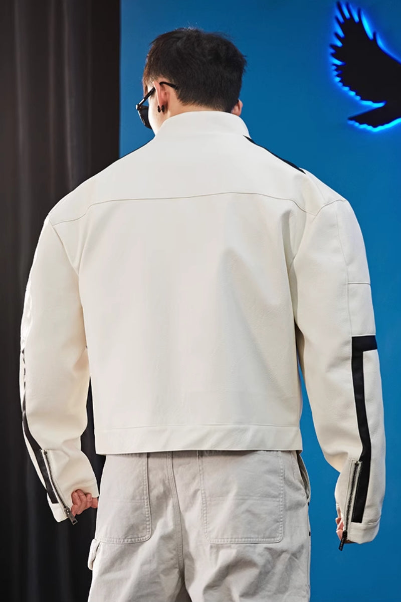 力強い印象を放つショート丈のライダースジャケット。耐久性のあるPUレザーをベースに、コントラストラインと袖のロゴがスポーティな存在感を演出。ゆったりとしたシルエットと落肩デザインでトレーニー体型にもフィットし、ストリートからバイクシーンまで幅広く活躍。内側にはポリエステルライニングを採用し、軽快な着心地と防風性を兼備。