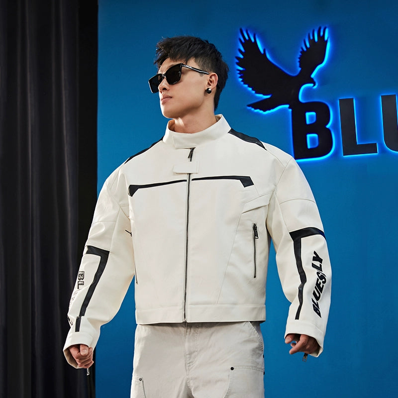 力強い印象を放つショート丈のライダースジャケット。耐久性のあるPUレザーをベースに、コントラストラインと袖のロゴがスポーティな存在感を演出。ゆったりとしたシルエットと落肩デザインでトレーニー体型にもフィットし、ストリートからバイクシーンまで幅広く活躍。内側にはポリエステルライニングを採用し、軽快な着心地と防風性を兼備。