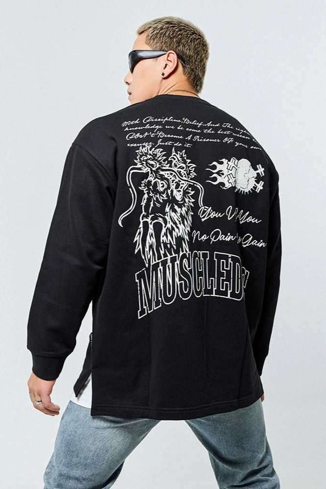 フロントにシンプルな「M」ロゴを配置し、背面には炎をまとったドラゴングラフィックを大胆にプリントしたスウェットシャツ。85%コットンをベースにした柔らかな生地は肌触りが良く、15%のポリエステル混紡でシルエットの安定感と耐久性をプラス。ゆったりとしたワイドシルエットでリラックス感があり、ストリートからジム後の着こなしまで幅広く対応。